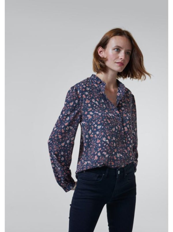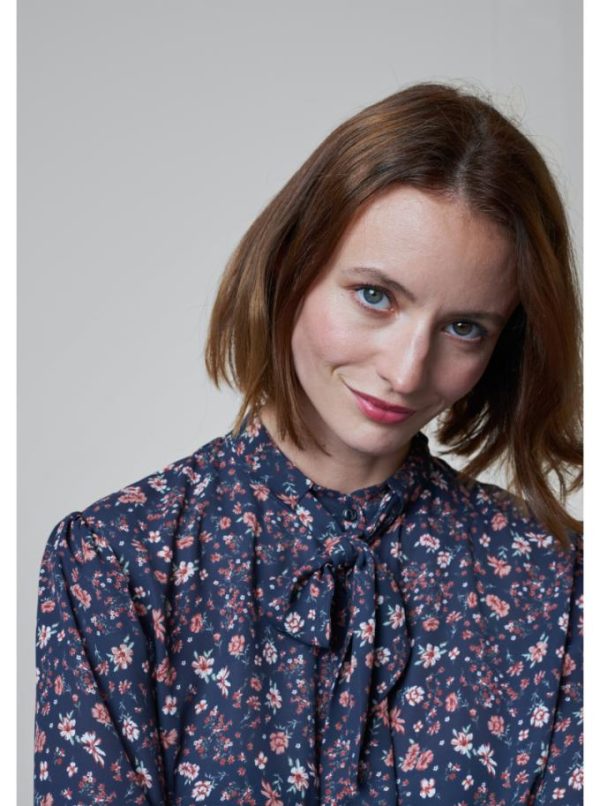 Son col rond s’ouvre pour un style plus décontracté et se ferme avec un détail lavallière. Les fronces au niveau de l’emmanchure structurent la matière ample de cette blouse.