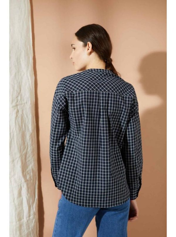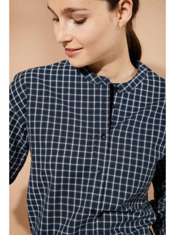 Blouse manches longues. Encolure ronde avec pied de col, entièrement boutonnée sur le devant. Volume et longueur classique.