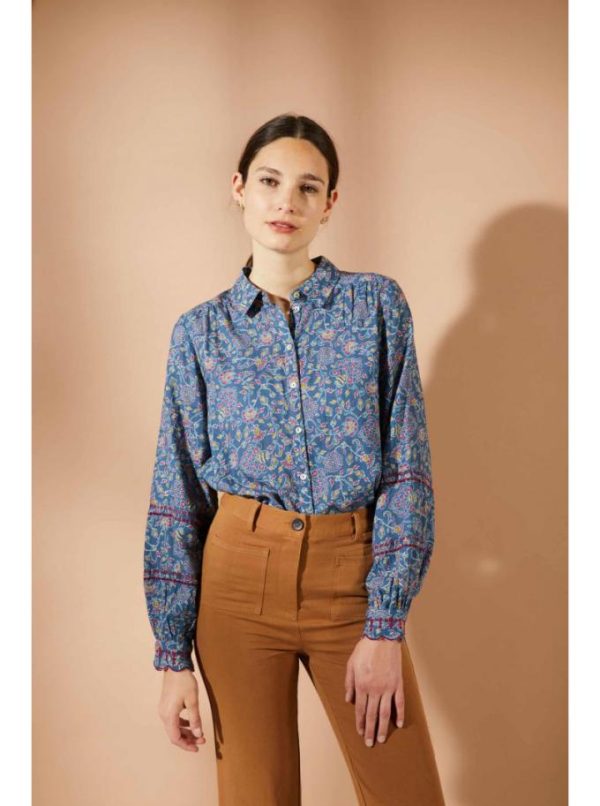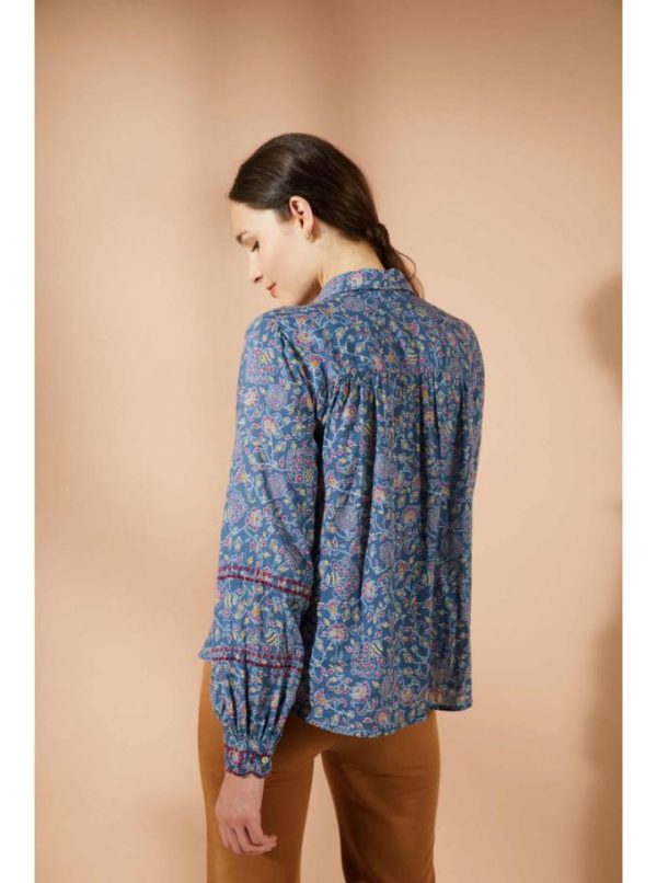 Chemise imprimée aux manches longues élégamment amples, offrant une coupe classique raffinée. Des fronces délicates ornent les épaules et le dos, tandis que des broderies artisanales embellissent les manches et les poignets.
