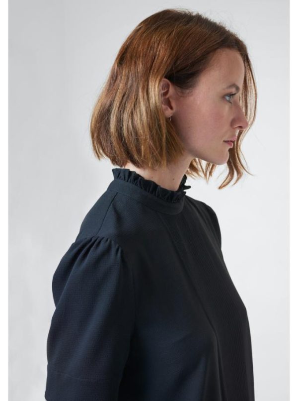 D’une élégance raffinée au caractère vintage assumé, elle sublime instantanément vos jeans préférés. Son col montant orné de volants délicats et de fronces subtiles lui confère une allure littéraire au charme espiègle, magnifiquement contrastée par la longueur sophistiquée de ses manches. La fermeture dans le dos s’opère grâce à un bouton en corozo soigneusement sélectionné pour son authenticité.