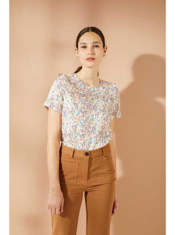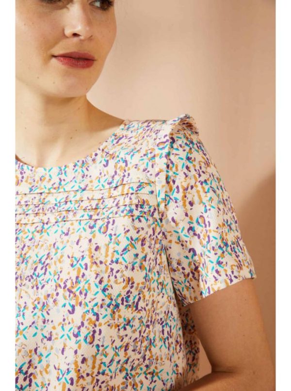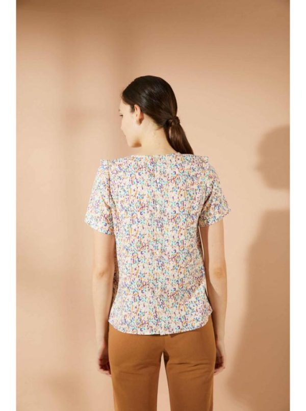 Blouse manches courtes et col rond. Détails d’empiècements aux épaules et jeux de plis sur le devant. Entièrement boutonnée au dos. Imprimé confetti exclusif.