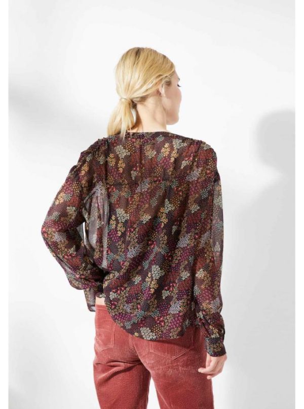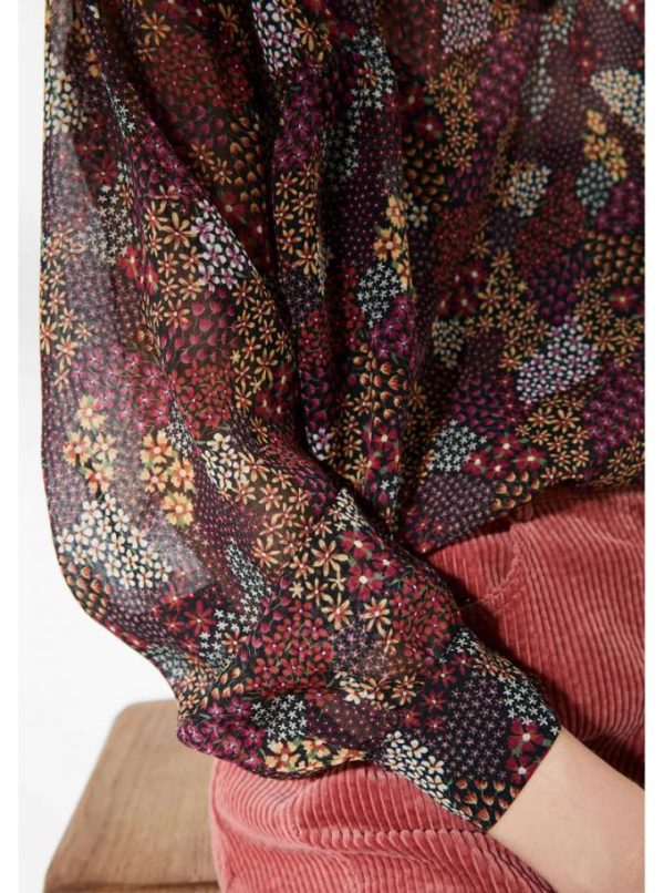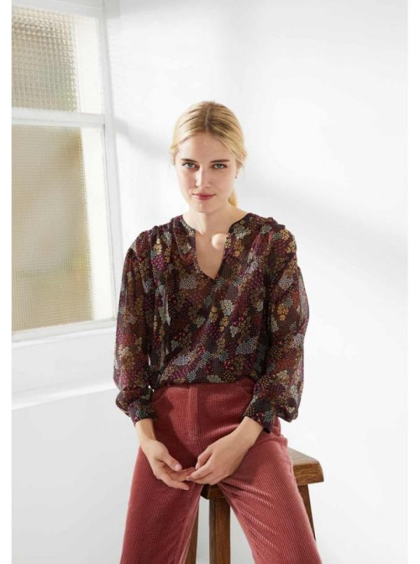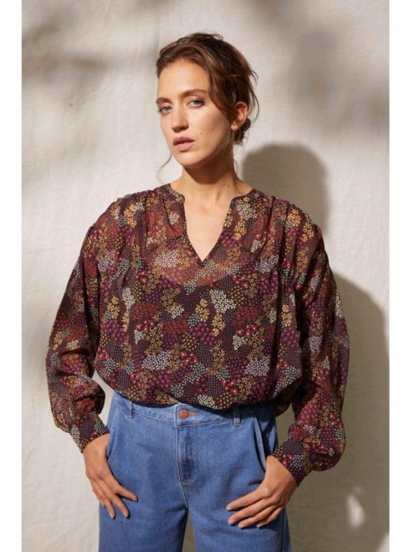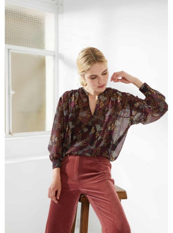 Blouse manches longues, légèrement transparente. Encolure V, les poignets se ferment par de petits boutons.