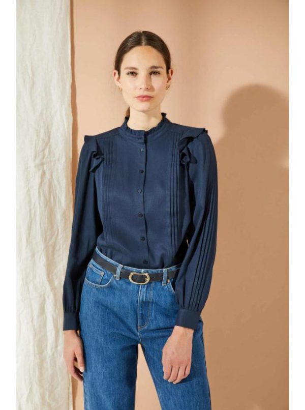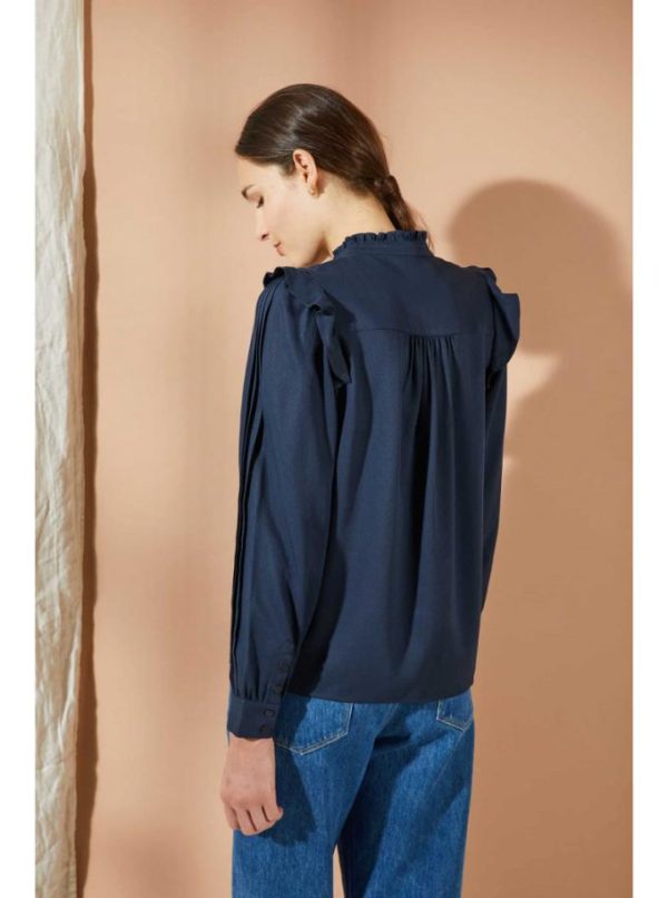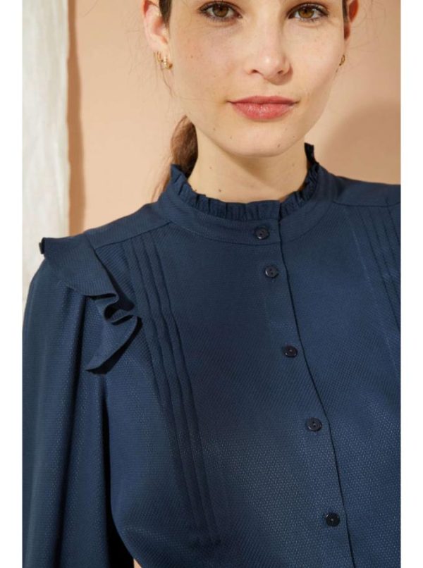 Blouse manches longues, col montant volanté. Entièrement boutonnée sur le devant, ses emmanchures sont ornées d’un volant. Jeux de plis sur le devant de la blouse et le dessus des manches. Bas de manches boutonnés.