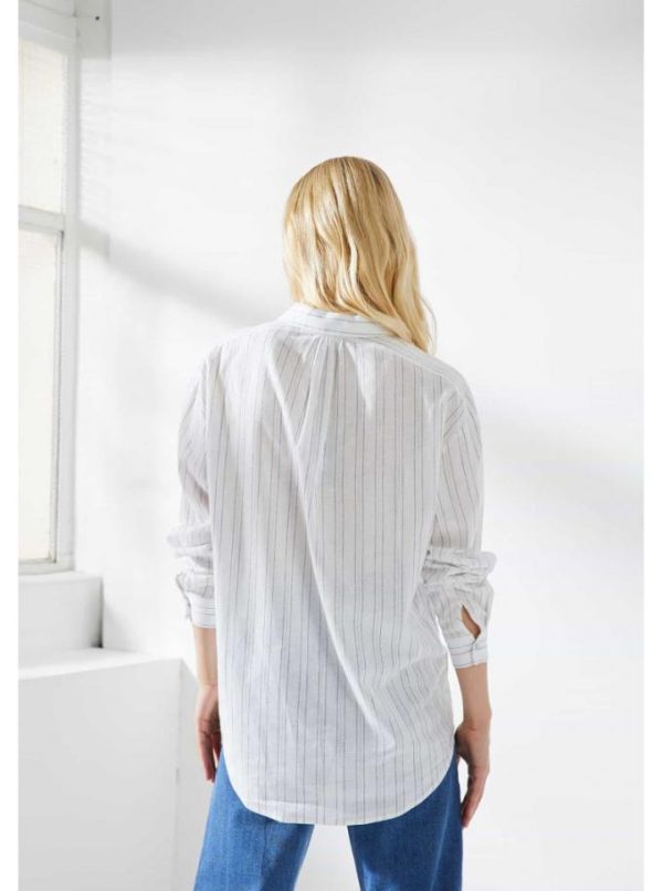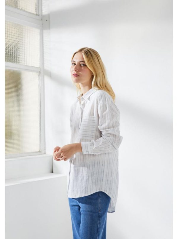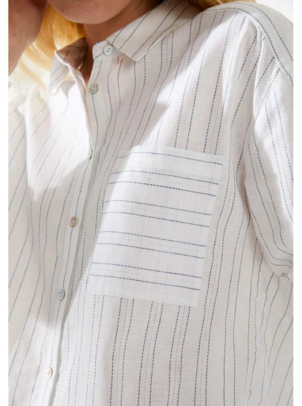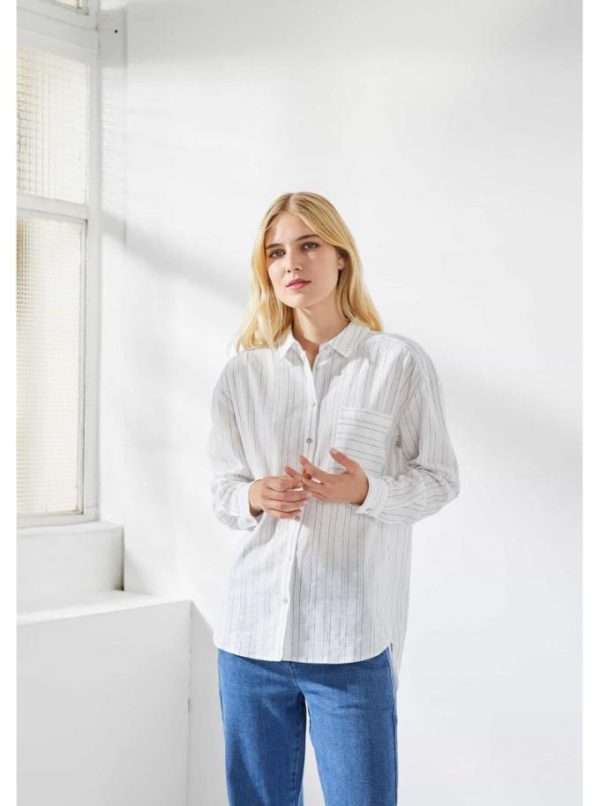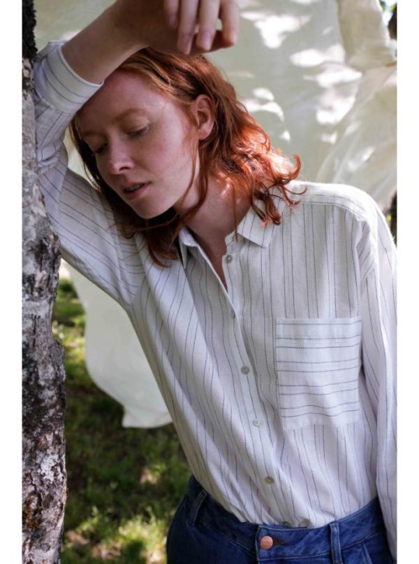 Chemise manches longues, entièrement boutonnée avec de petits boutons nacrés. Bas de la chemise arrondi, plus long à l’arrière. Une poche plaquée sur le devant. Rayure raffinée avec un détail ajouré ton sur ton.