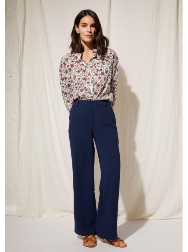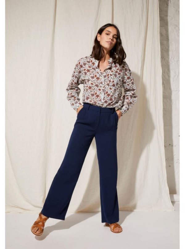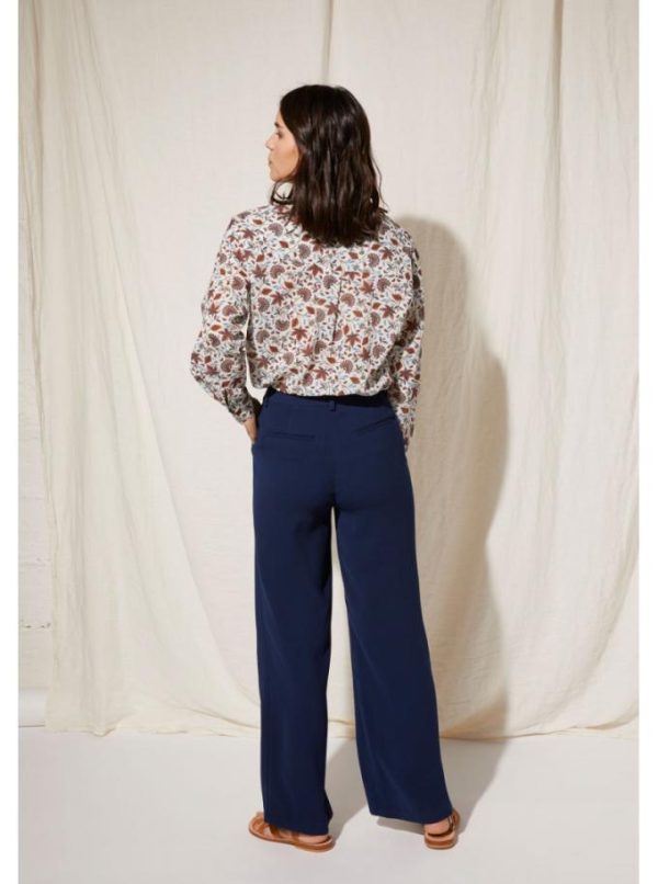 Pantalon à la coupe droite et large. Petits plis en dessous de la ceinture, poches italiennes de chaque côté, et poches passepoilées au dos. Il a deux passants à la taille à l’avant et se ferme à l’aide d’une agrafe, d’un bouton intérieur et d’un zip.
