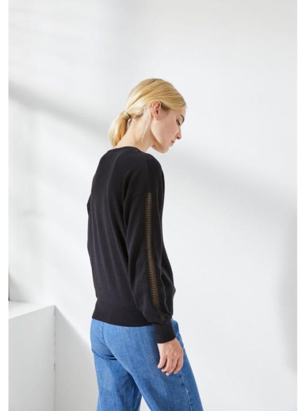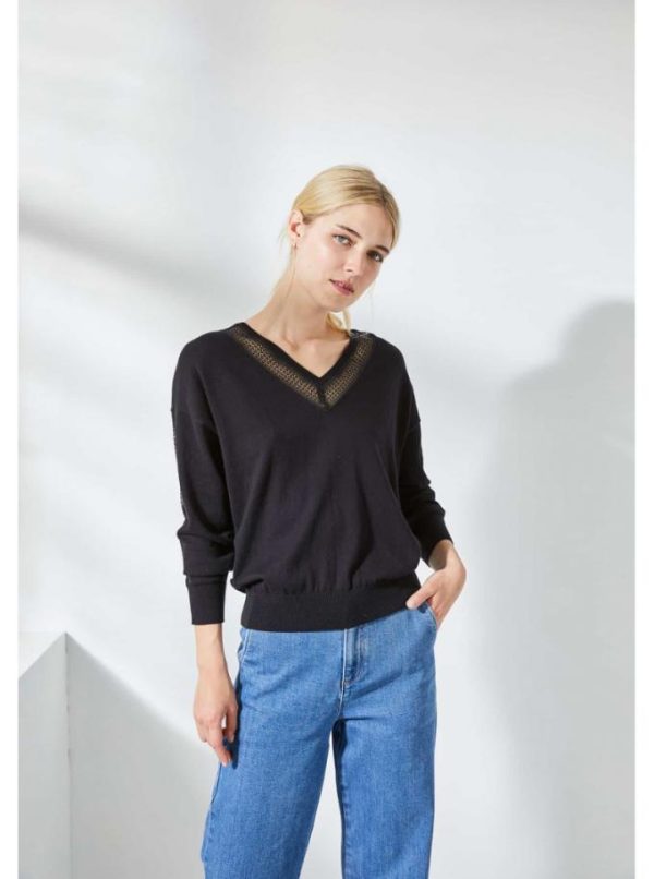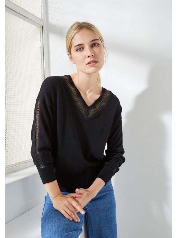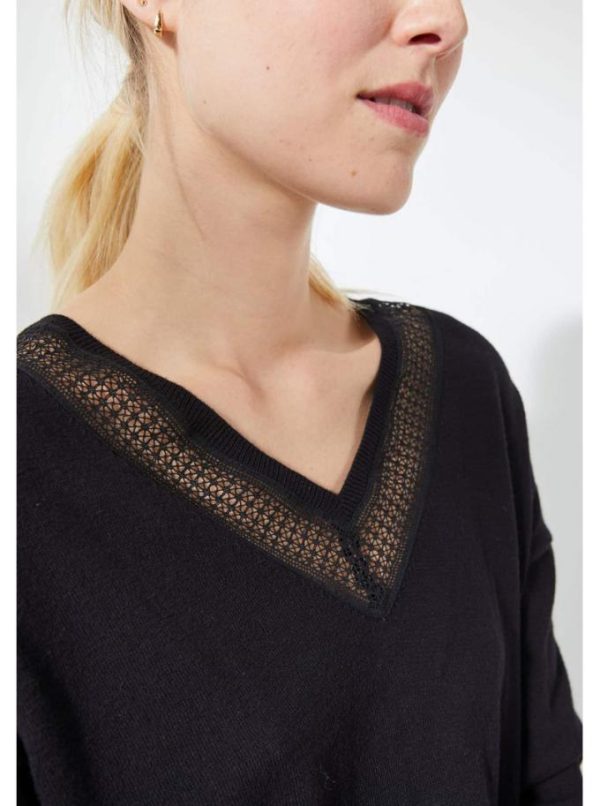 Pull tricoté en fine jauge d’exception, son mélange coton/soie offre une douceur enveloppante et un tombé raffiné. Col V délicatement travaillé et emmanchures descendues pour une élégance naturelle. Magnifiquement orné d’une bande de dentelle précieuse à l’encolure et sur le dessus des manches.