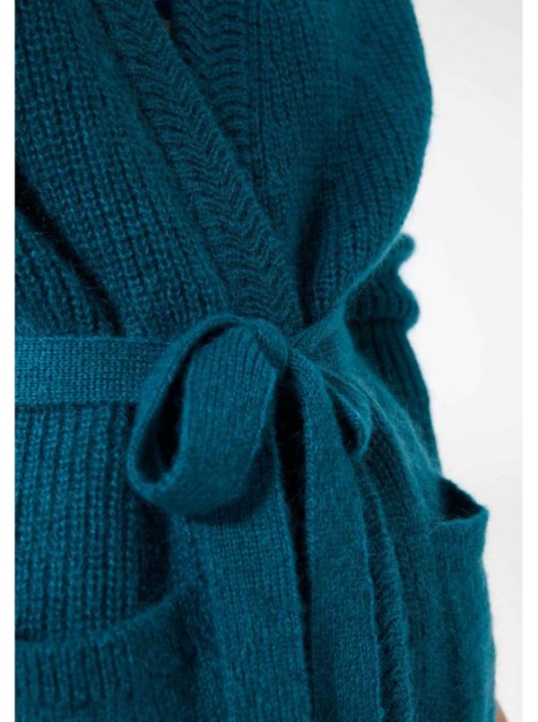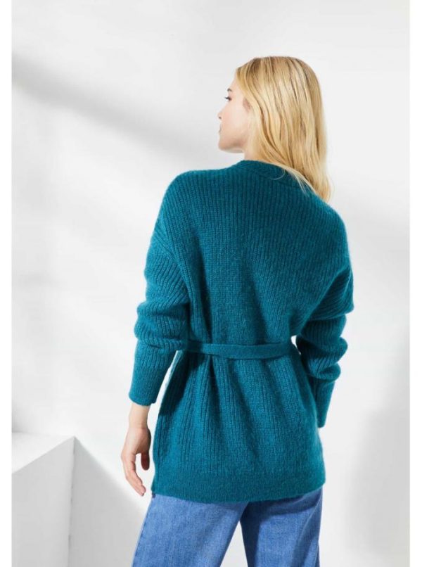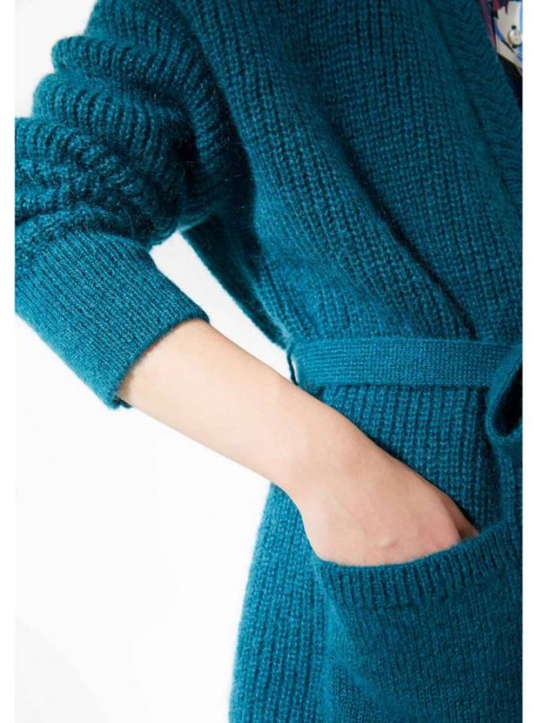 Gilet à pans ceinturé. Tricoté en côtes perlées. Col V, volume droit. Tricotage fantaisie le long de l’encolure. Deux poches plaquées. Finitions côtes simples en bas de corps et bas de manches.