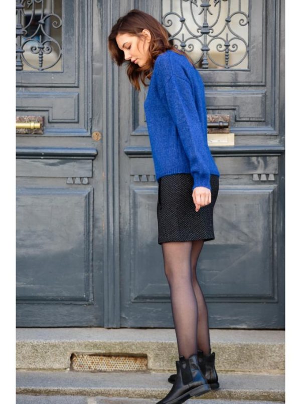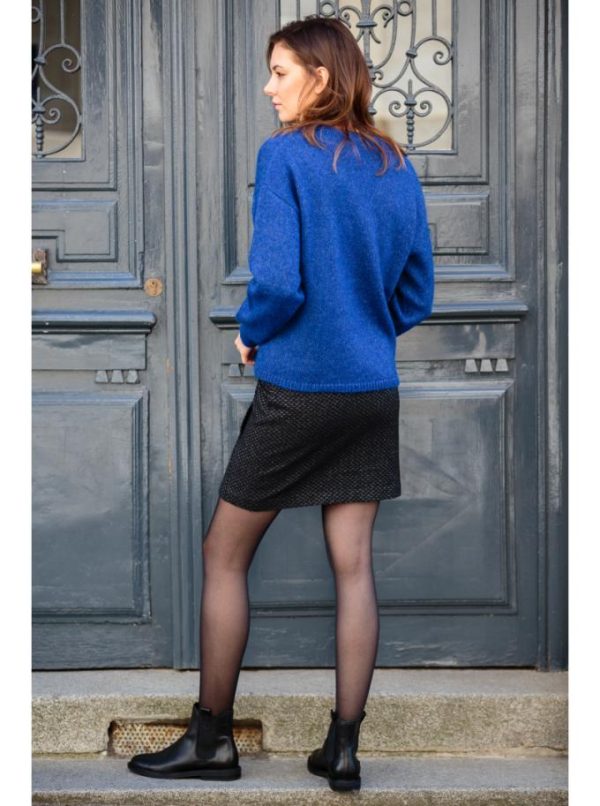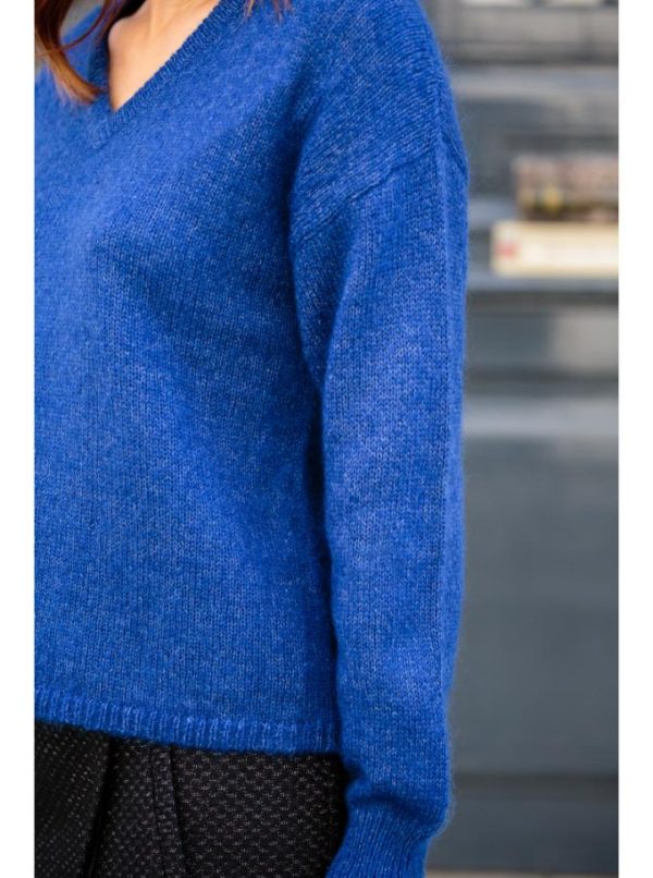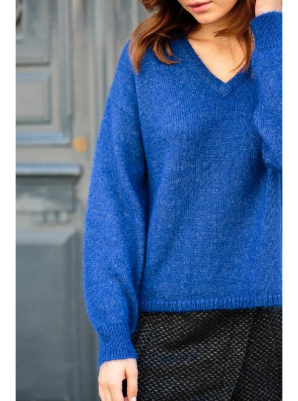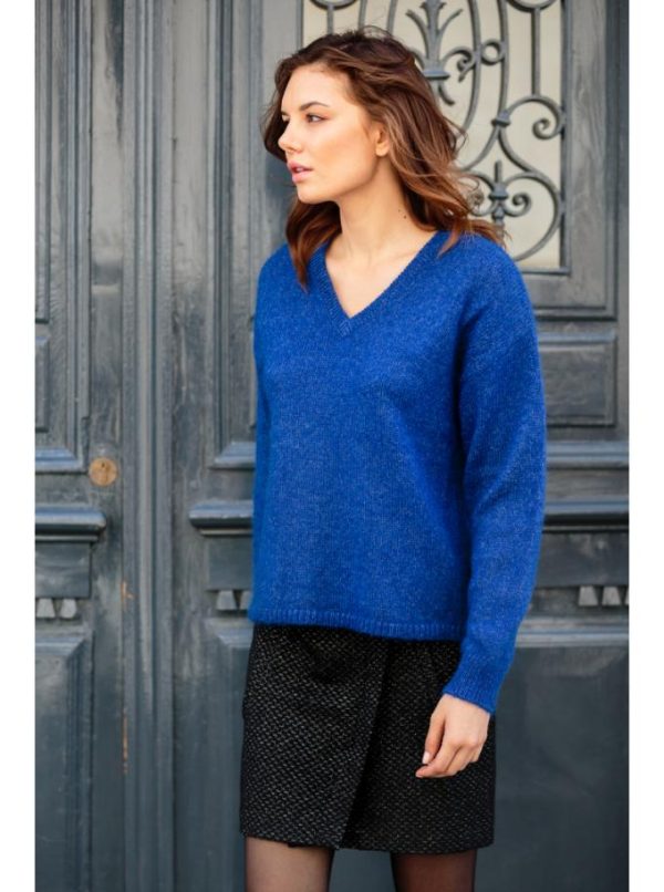 Pull loose. Col v. Rib au col, bas et poignet. Dimensions : Longueur 60 cm / Tour de poitrine 98 cm Laurina mesure 1m78 et porte une taille S 40% soie 36% mohair 24% laine Le mohair est une matière première noble, renouvelable et biodégradable. Elle est issue du duvet des chèvres angora et offre un écrin de douceur extrême.L’association de la soie, étoffe légère à l’élégance raffinée avec le mohair, donne un résultat d’une qualité rare. Lavage à la main uniquement Séchage sur cintre, à l’abri du soleil Repassage sur l’envers Ne pas laisser tremper Ne pas tordre