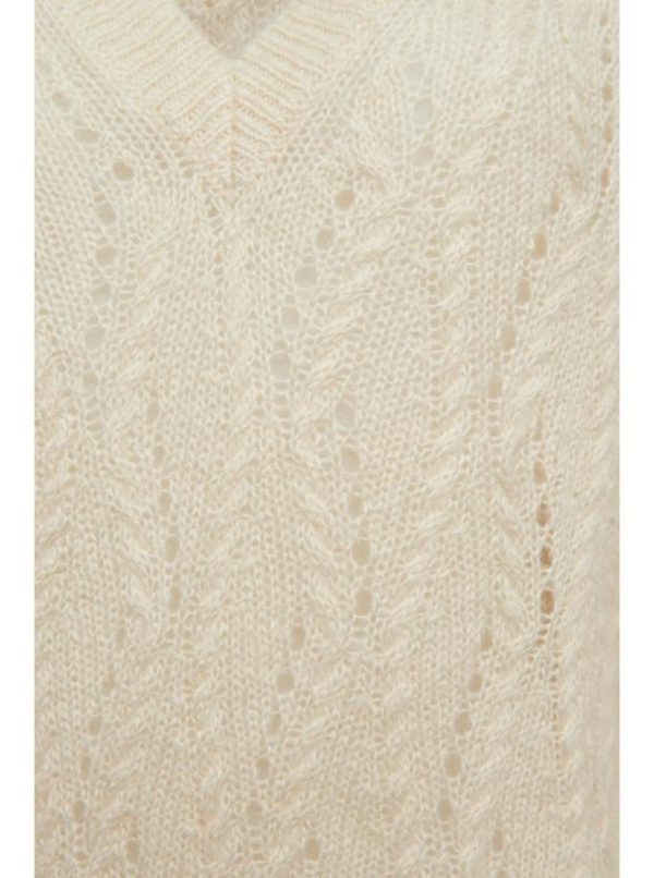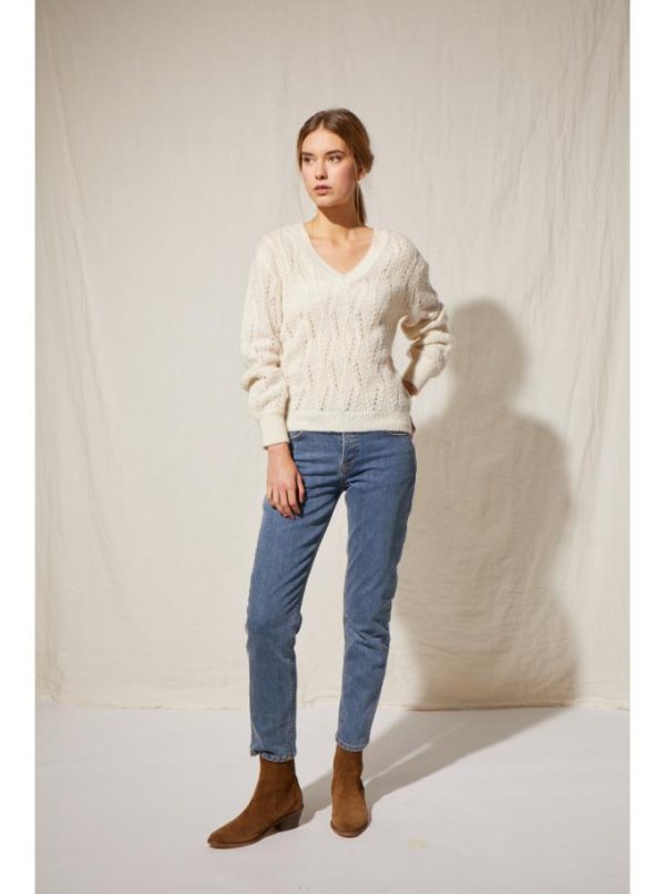 Une maille élégante, intemporelle et lumineuse. En noir, ocre ou beige, elle est née d’un mélange incroyablement doux et généreux, de soie, mohair et laine.Ses manches ballons apportent un volume qui réveille la coupe droite du pull. Tricoté en jersey, on aime le détail du point fantaisie sur l’encolure V, entre tresse et torsade. Ces détails en relief des jeux de mailles se mélangeront avec l’un de nos pantalons imprimés pour un look arty. Pour un style plus casual, on le porte avec l’un de nos tailleurs.