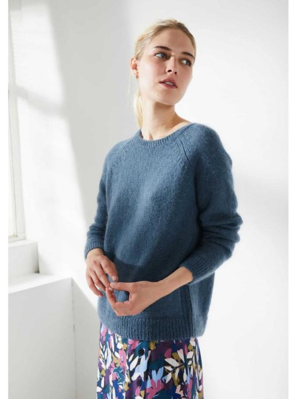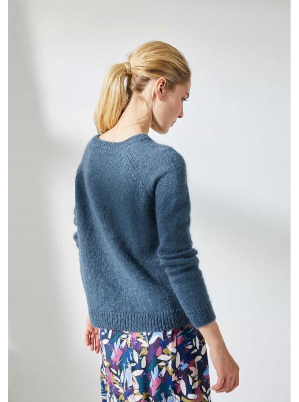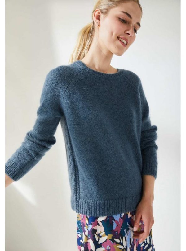 Pull col rond, au volume droit et longueur classique. Finitions côtes simples en bas de manches, bas de col et bas de corps. Emmanchures raglan, il est orné d’une bande de points ajourés de chaque côté du pull.