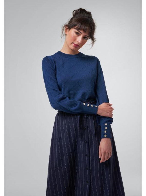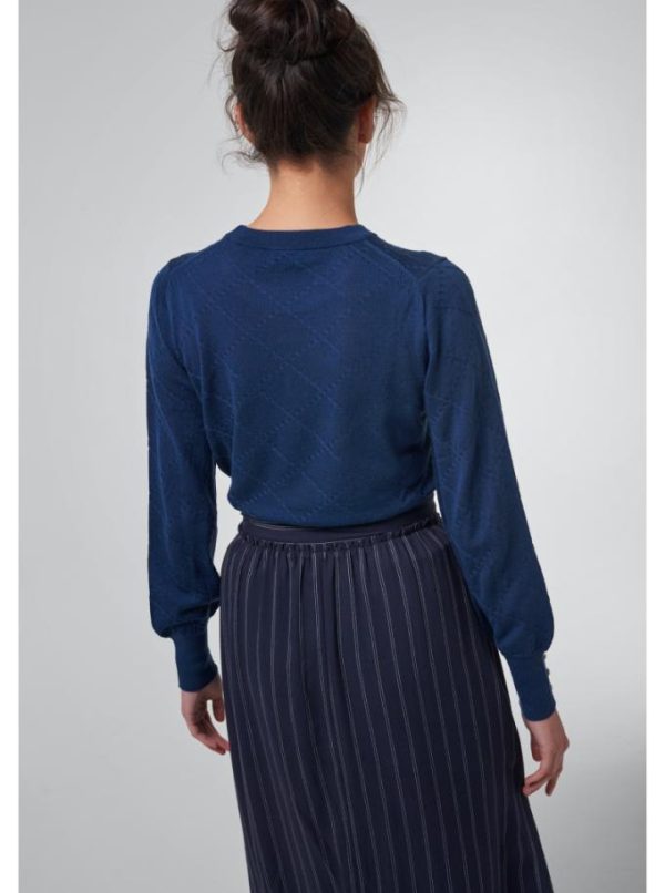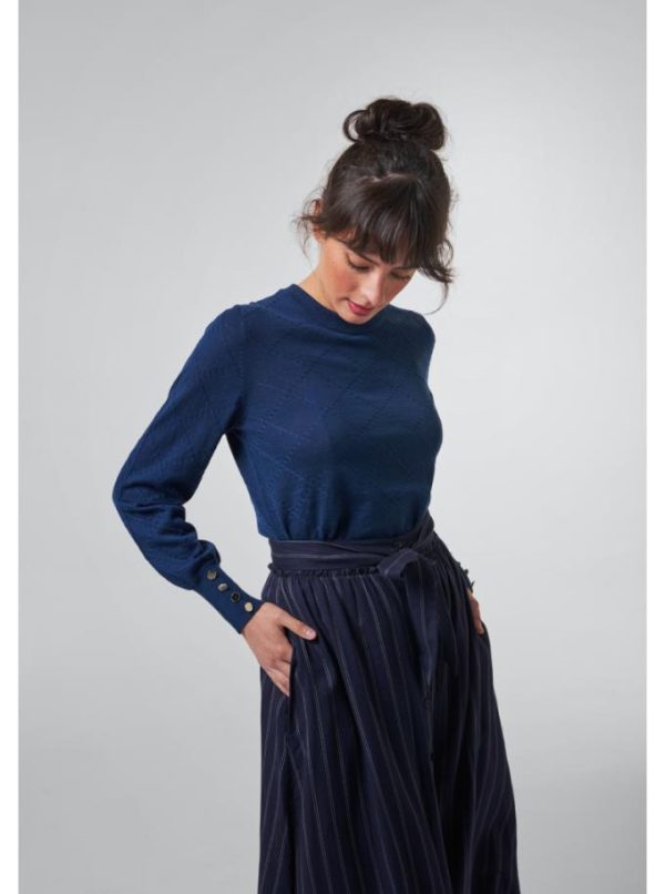 En laine certifiée RWS, on aime le tramage de cette maille et les détails tout en relief graphique de ce pull délicat. Au col rond et de coupe droite, il est légèrement plus cintré au bas de la taille. On note également la patte de boutons bijoux au niveau des emmanchures.