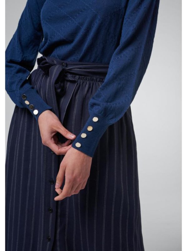 On le porte à même la peau sur un jean en automne, puis sous un blazer et un manteau en hiver. Pour un style plus littéraire et romantique, on le porte avec l’une de nos jupes longues.