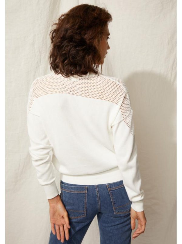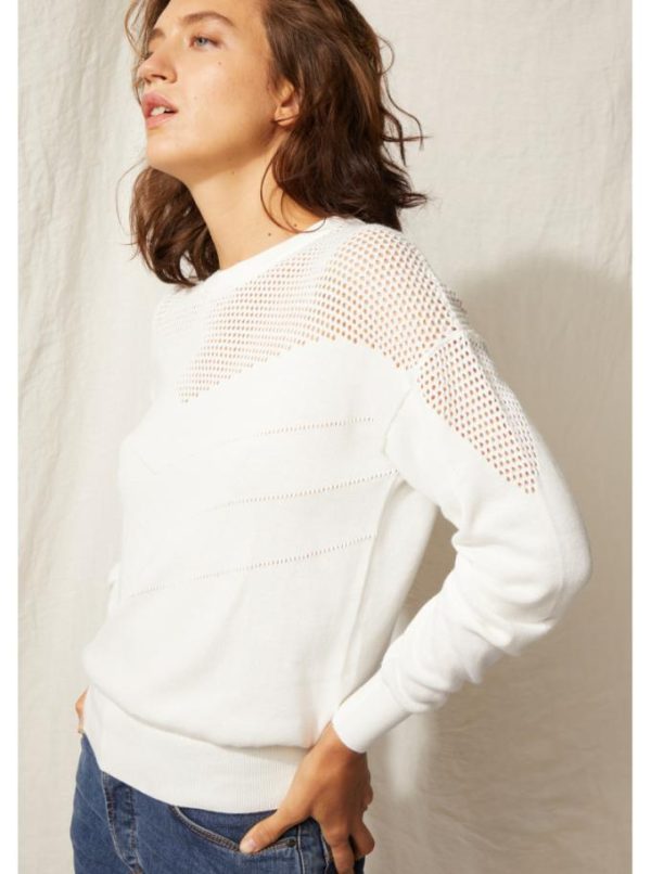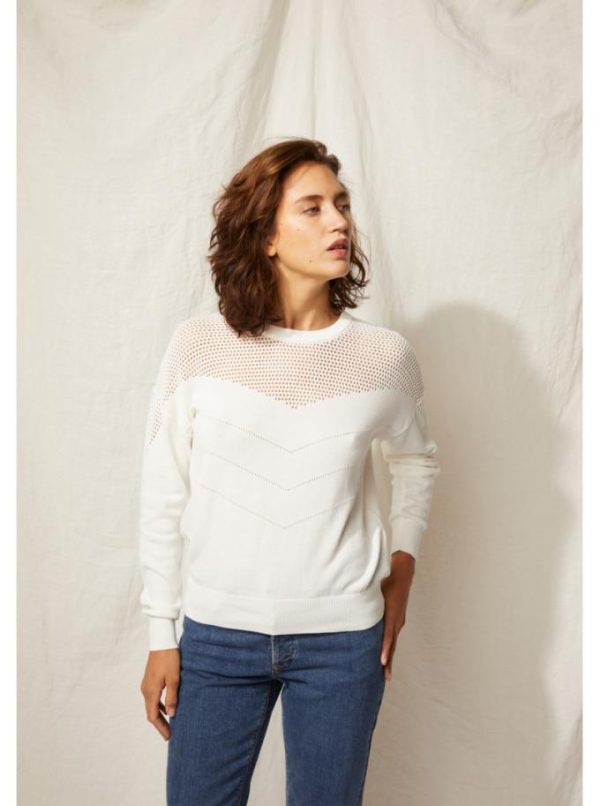Pull 100% coton tricoté en fine jauge. Encolure ronde. Jeu de points ajourés en haut du pull et travail de points jour échelle en V sur le devant. Emmanchures descendues.