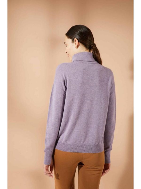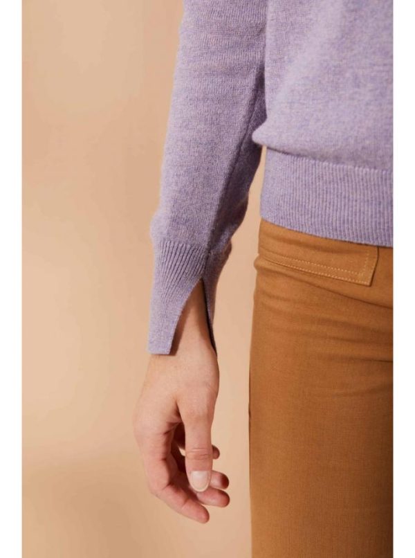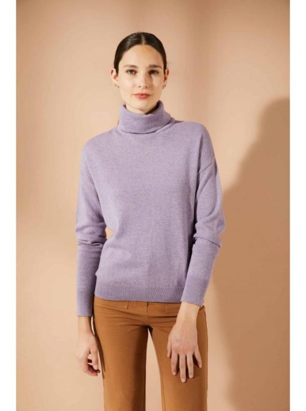 Pull col roulé tricoté en fine jauge. Emmanchures descendues et volume légèrement boîte. Finitions côtes simples en bas de manches, et en bas de corps. Longueur classique. Détail : fente en bas de manches. Coloris lilas chiné.
