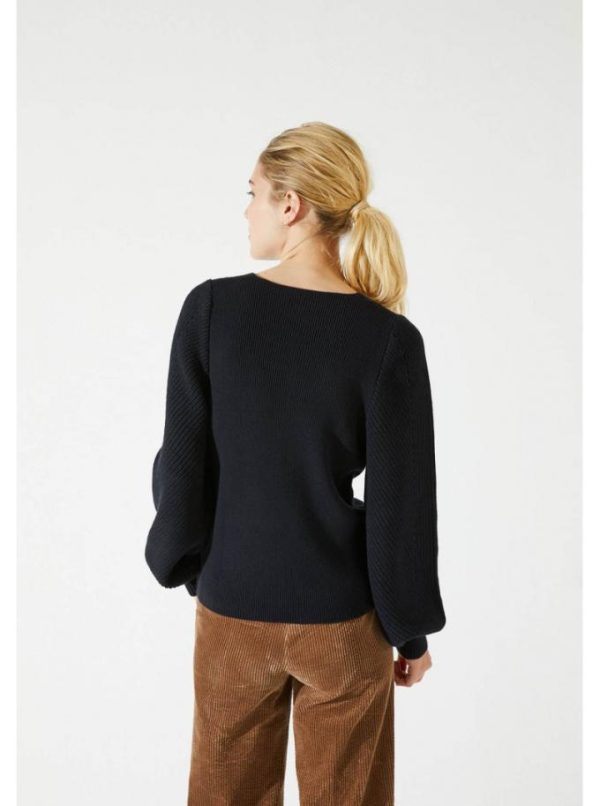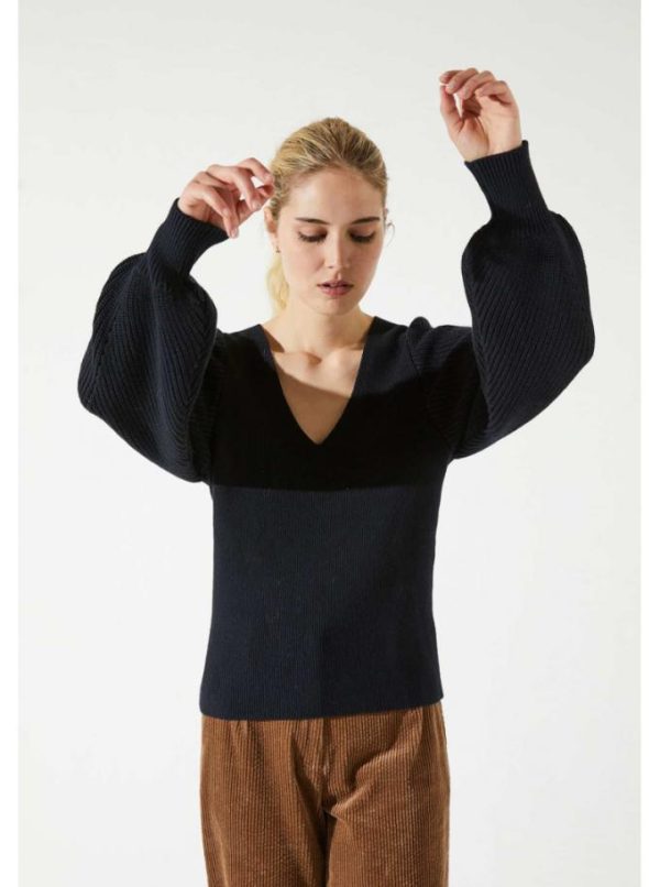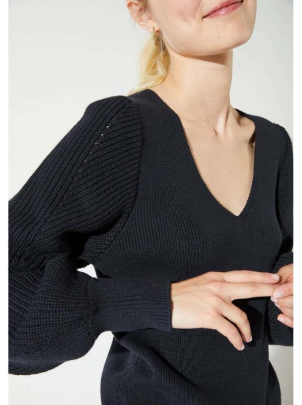Tricotage en côtes sur le corps et en côtes perlées sur les manches avec un jeu de points ajourés. Col V, bas de manches amples resserrées par un haut poignet en côtes.