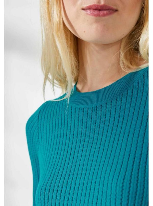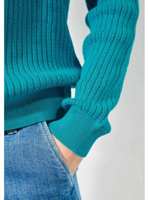 Pull col rond. Tricotage fantaisie avec un fin ajouré. Finitions cotes simples au col, en bas de manches et en bas de corps.