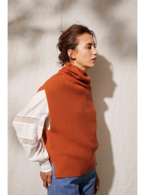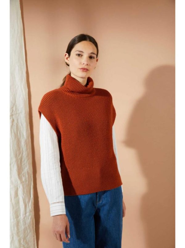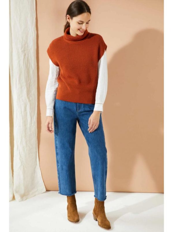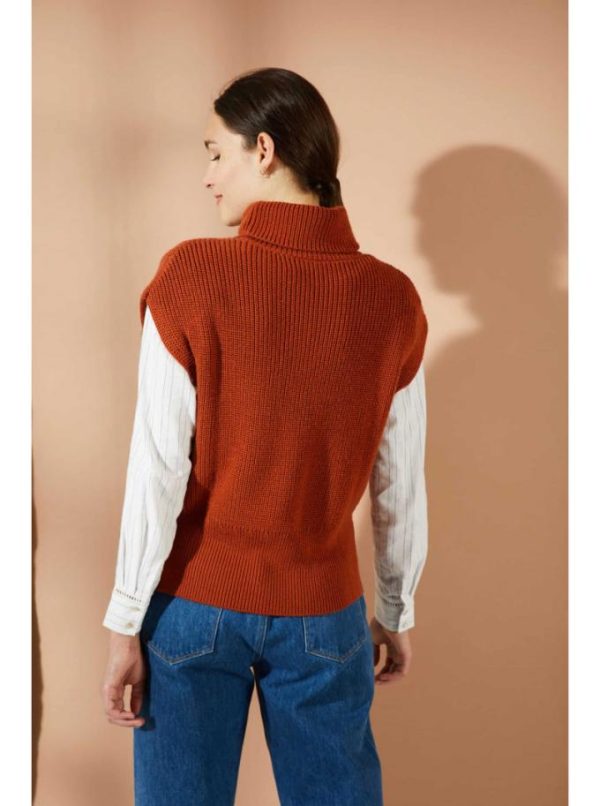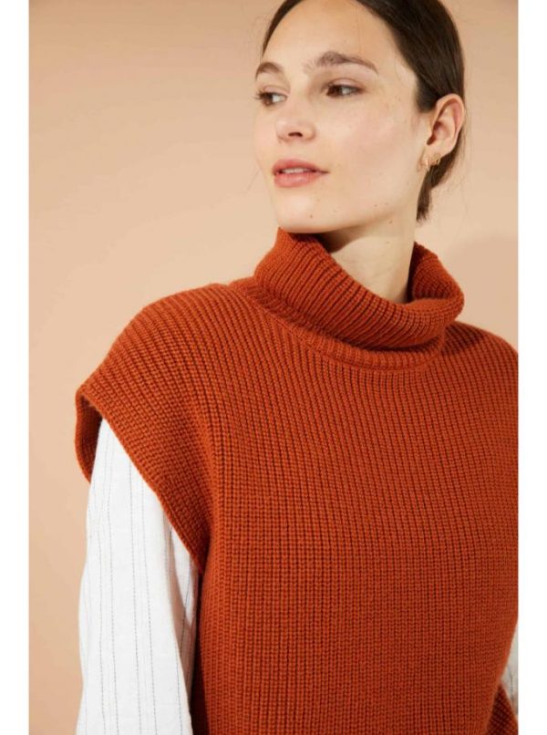 Pull col roulé sans manches. Tricoté en côtes perlées. Finition large bord côte en bas de corps et fentes sur les côtés.