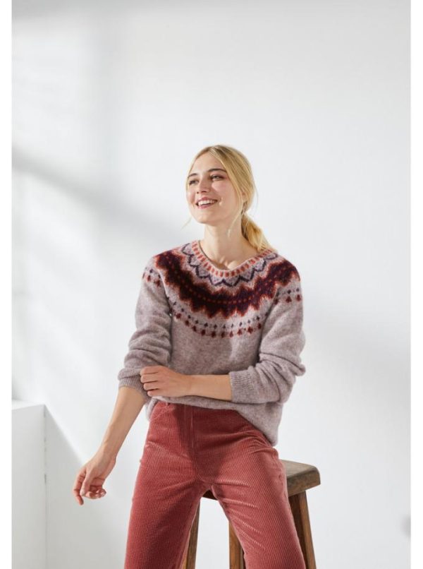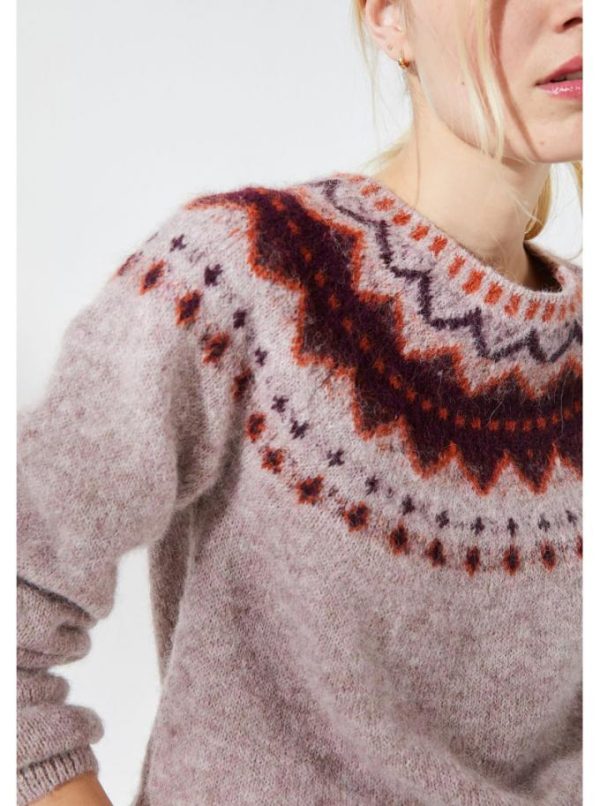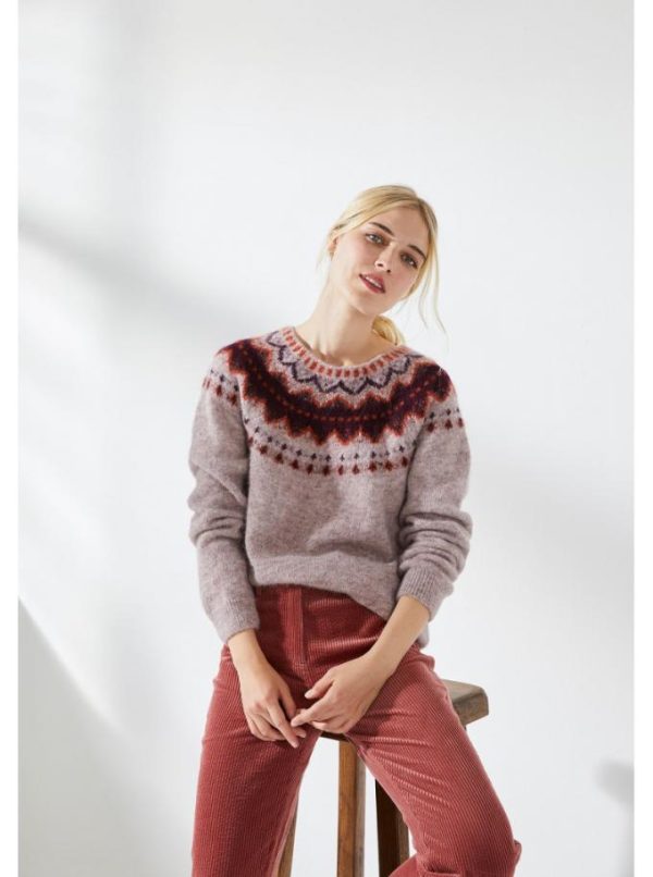 Pull col rond. Volume et longueur classique. Emmanchures raglan. Motif jacquard tricoté tout autour de l’encolure dans les tons bordeaux et brique, coloris principal lilas chiné.