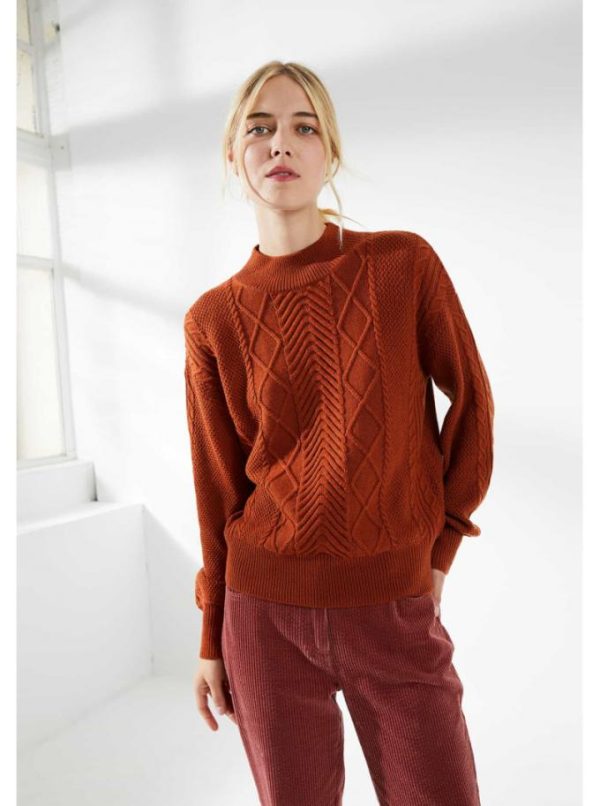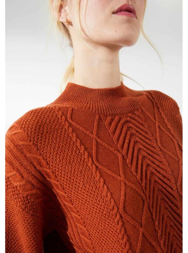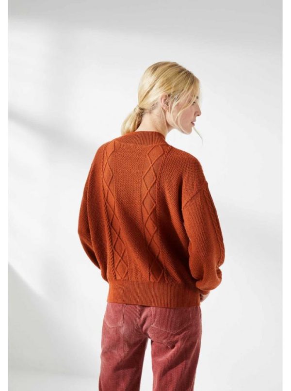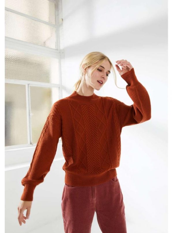 Pull col montant. Jeux de tricotage torsadé sur le corps et les manches. Emmanchures descendues. Large bord côte à l’encolure, en bas de manches et en bas de corps.