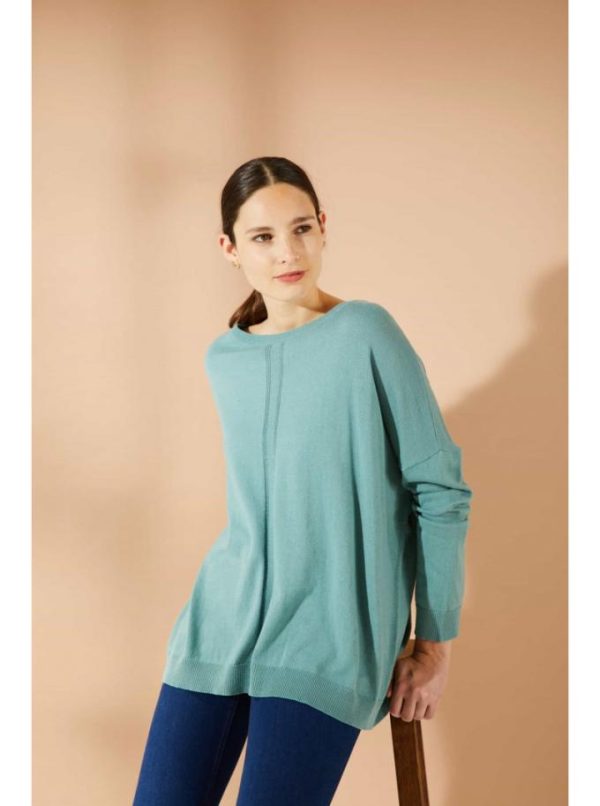 Pull tricoté en fine jauge, son mélange coton/ soie lui confère un toucher très doux. Pull oversize, avec emmanchures basses. Il est orné d’une bande de points ajourés sur le devant.