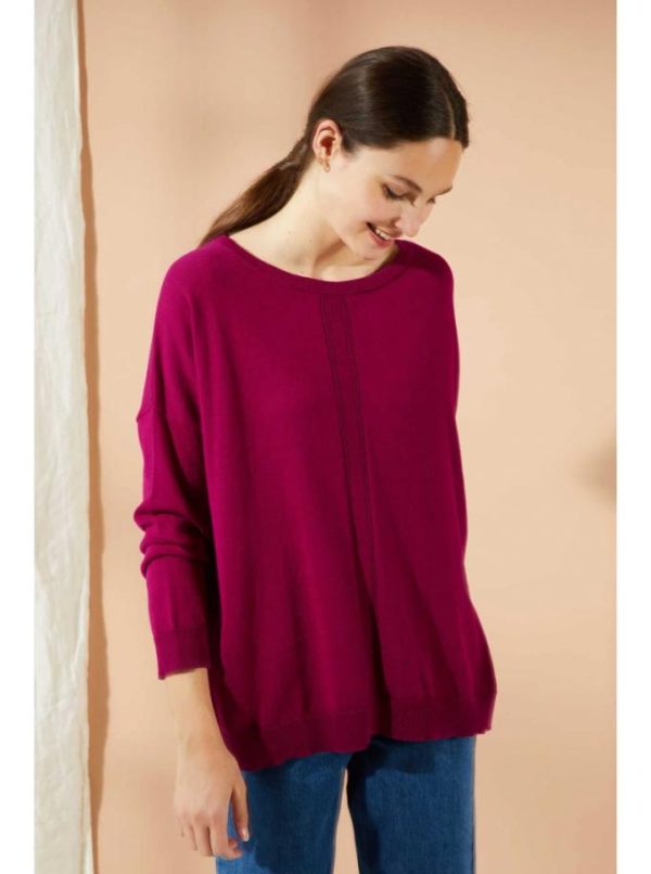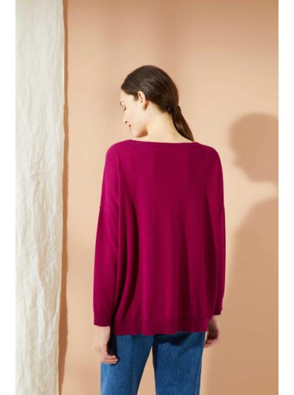 Pull tricoté en fine jauge, son mélange coton/ soie lui confère un toucher très doux. Pull oversize, avec emmanchures basses. Il est orné d’une bande de points ajourés sur le devant.