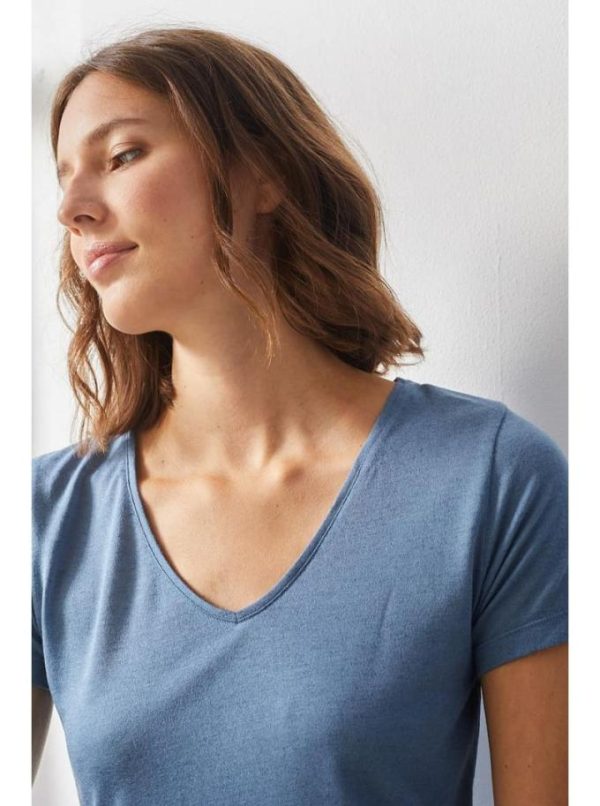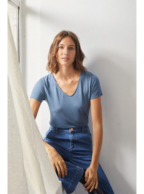 Notre T-shirt est composé à 90% de Micromodal et 10% cashmere. Le mélange Micromodal et cachemire est d’une douceur incomparable et très léger au porter. Notre T-shirt encolure V manches courtes, nous réchauffe toute la saison sous un pull ou sous une veste.