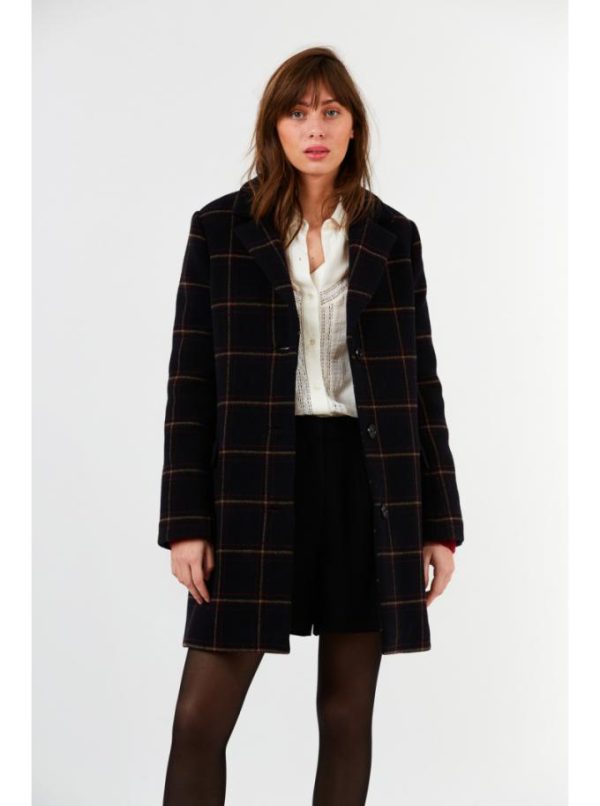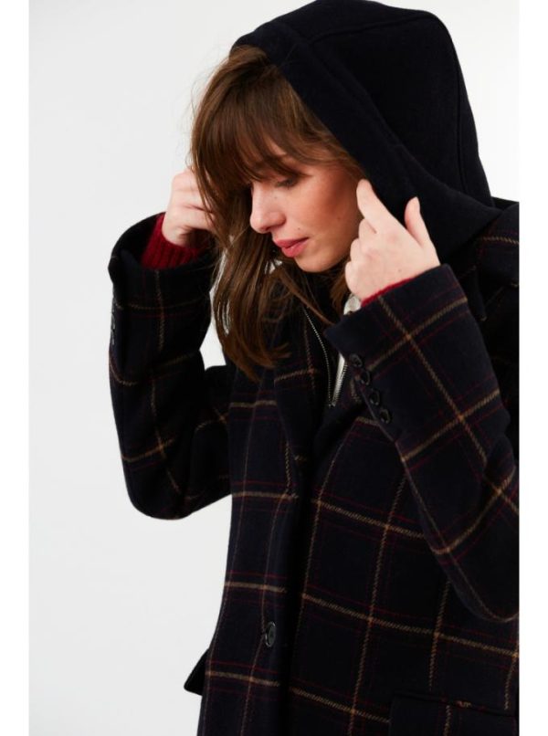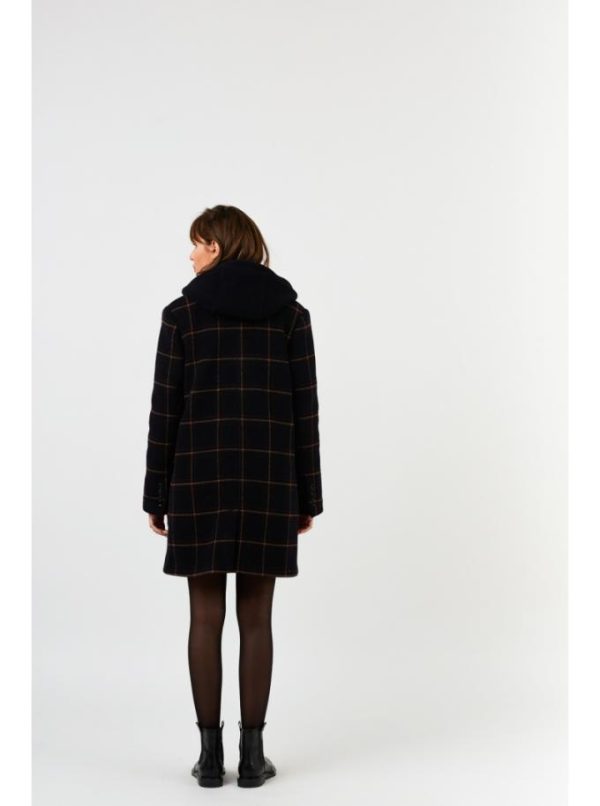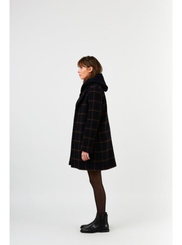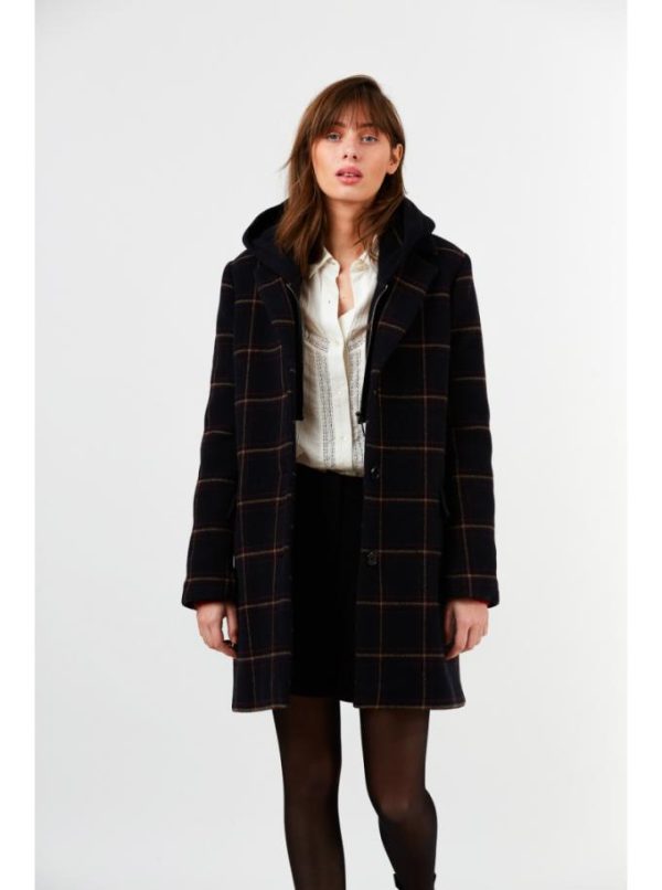 Manteau coupe droite. Ouverture devant par 3 boutons. Poches à rabat. Capuche en matière contrastée, fermeture zippée, amovible par pressions. Dimensions : Longueur 86 cm / Tour de poitrine 98 cm Léa mesure 1m67 et porte une taille 38 78% laine recyclee 13% polyamide 5% polyamide recycle 4% polyester recycledoublure corps: 100% lyocelldoublure manche: 100% polyester recycle Ces fibres proviennent de vêtements qui ne sont plus utilisés et de chutes de tissus, à partir desquels la création d’un nouveau fil est possible. L’intégralité du processus, du recyclage au tissage de la matière, est soumis à des règles strictes. Recyclage de l’eau, utilisation de panneaux photovoltaïques, limitation des transports, compensation carbone sont les moyens mis en œuvre par les usines pour atteindre un objectif Zéro Impact. Nettoyage à sec doux