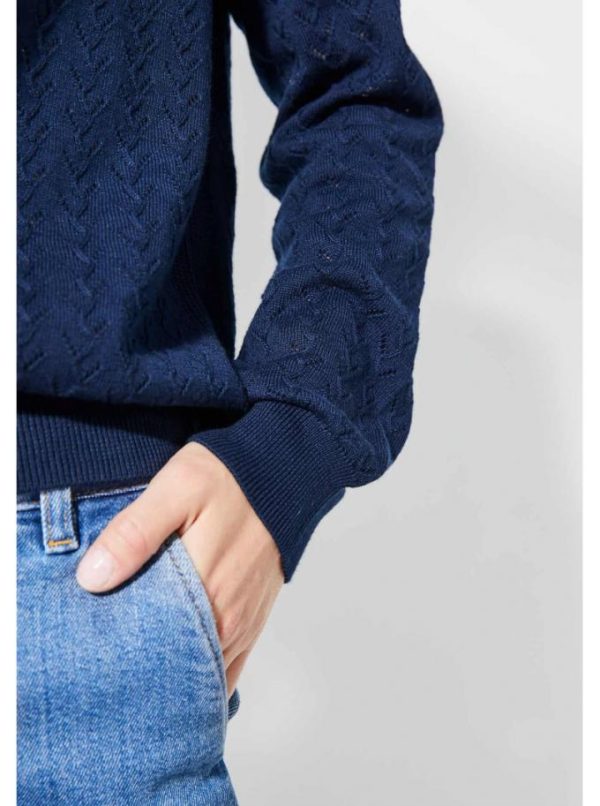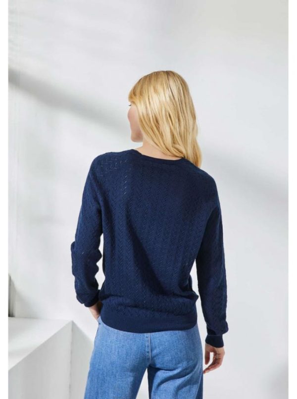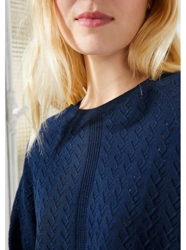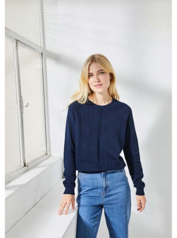 Pull 100% coton. Col rond. Tricotage fantaisie raffiné avec un jeu de points ajourés en V, bande centrale tricotée en côtes perlées sur le devant. Finitions côtes simples au col, en bas de manches, et en bas de corps. Emmanchures raglan.