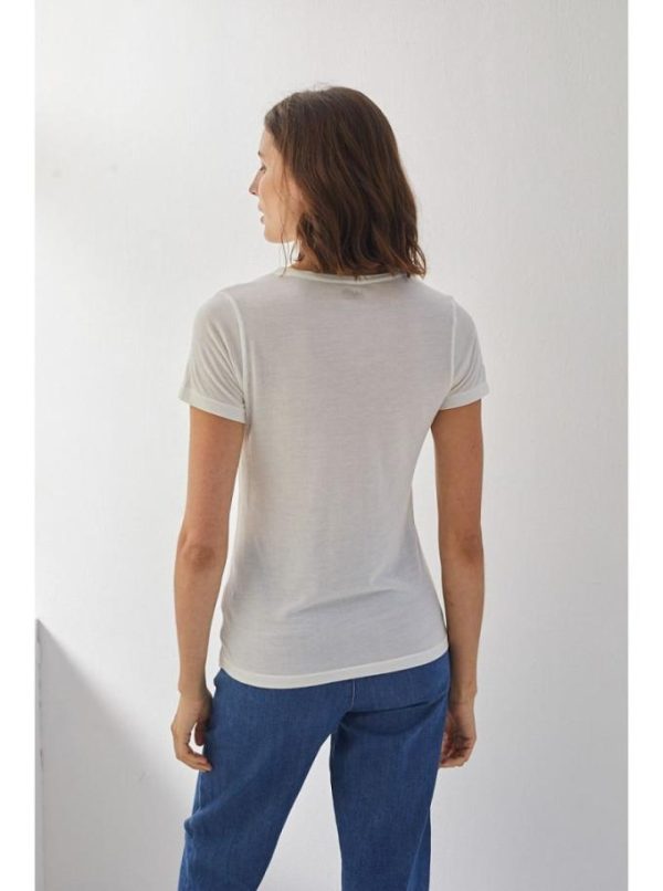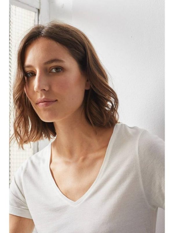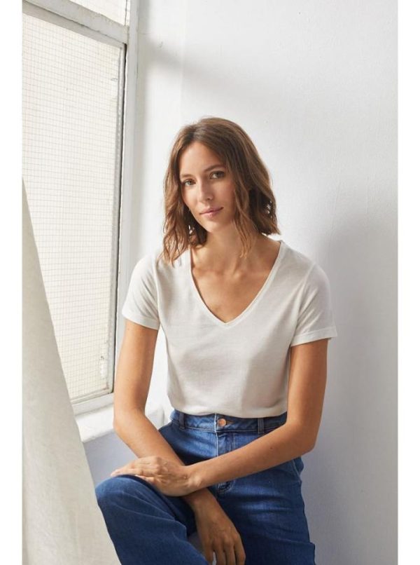 Notre T-shirt est composé à 90% de Micromodal et 10% cashmere. Ce mélange exclusif offre une douceur enveloppante exceptionnelle et une légèreté remarquable au porter. Notre T-shirt encolure V manches courtes, apporte une chaleur délicate tout au long de la saison, parfait sous un pull ou une veste.