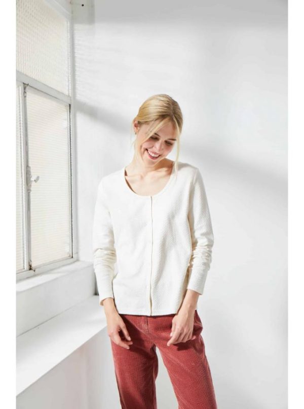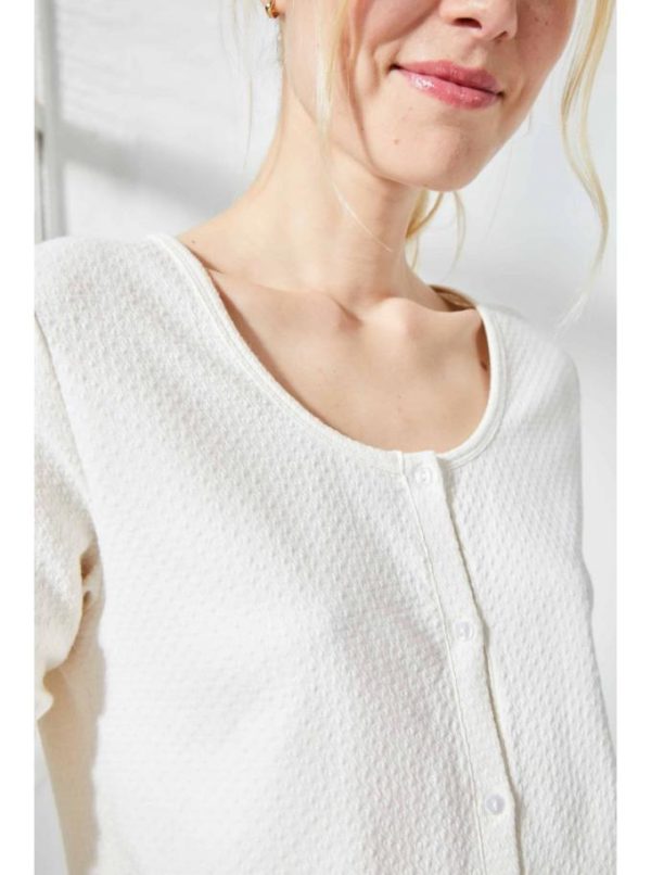 Sa matière délicatement tricotée présente un point fantaisie d’une grande finesse. Ce tee-shirt manches longues se distingue par sa fermeture intégrale boutonnée sur le devant. Encolure arrondie d’un classicisme intemporel. Volume et longueur ajustés pour une élégance naturelle.
